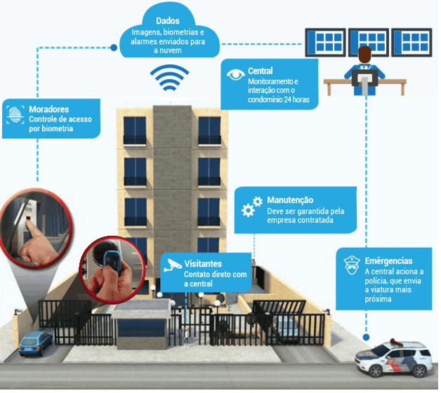 Serviço de portaria efetuado a partir de central de atendimento a distância. Por meio do sistema, o porteiro controla o acesso e realiza a comunicação: solicitação de identificação do visitante e pedido de autorização para o morador ou proprietário.